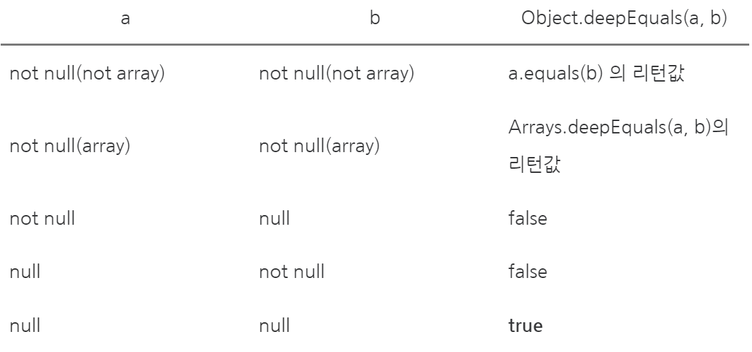Objects.deepEquals(a, b) 역시, 두 객체의 동등성을 비교하는 데 사용합니다.