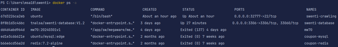 제가 생성한 'swenti-crawling' 컨테이너가 잘 생성된 것을 볼 수 있습니다.
