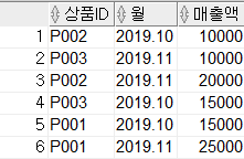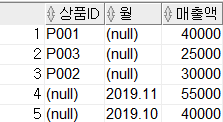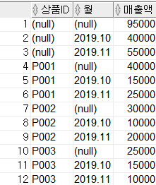 SELECT 상품ID, 월, SUM(매출액) AS 매출액