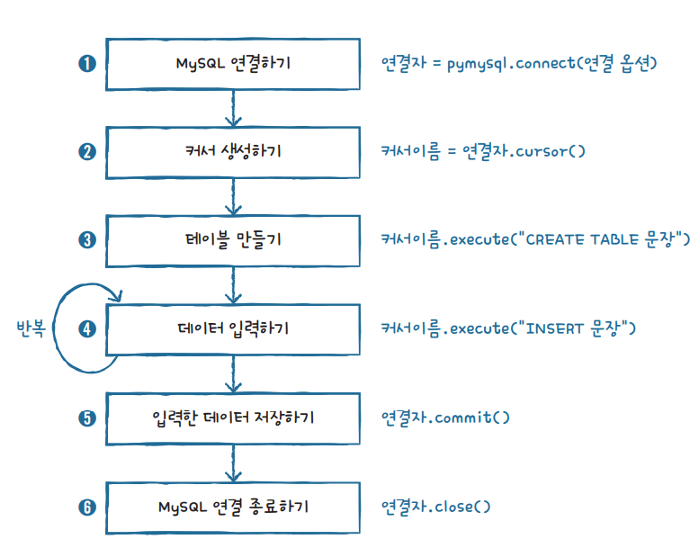conn = pymysql.connect(host=’서버 IP주소′, user=’사용자’, password=’암호′, db=’데이터베이스’, charset=‘사용할 문자셋’)