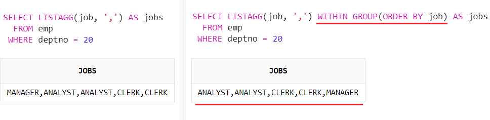LISTAGG 함수를 사용하여 칼럼의 문자열을 합칠 때 WITHIN GROUP 절을 사용하면 정렬이 가능합니다.
