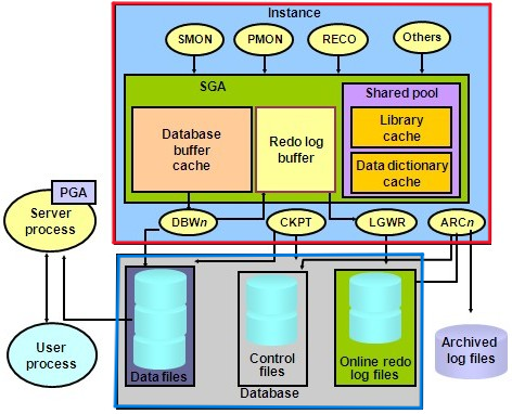위 그림에서 파란색 테두리의 영역은 디스크 영역을 의미합니다. 이 디스크 영역은 Data files, Control files, Online redo log files로 이루어져 있습니다.
